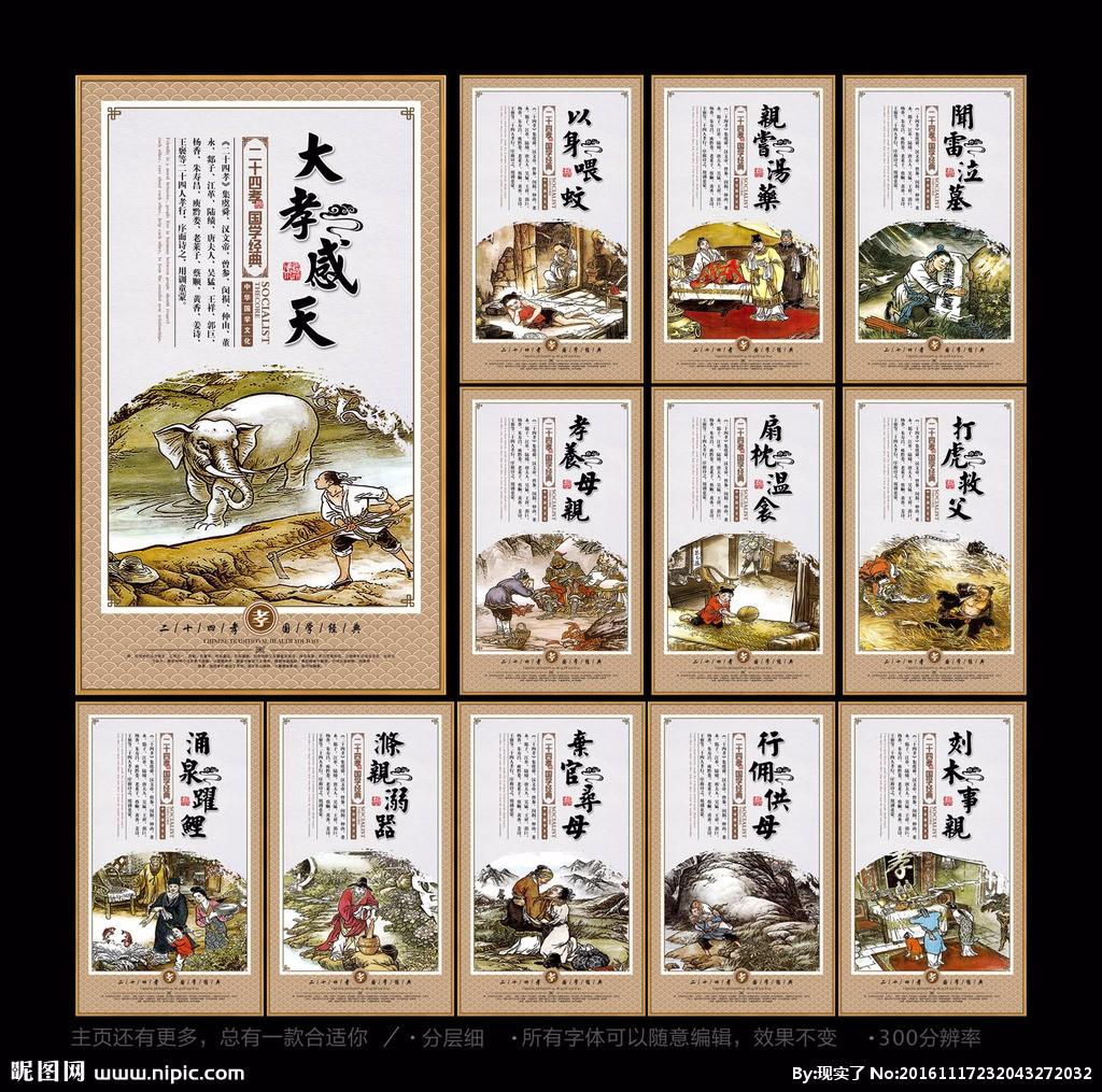 简介:俗话说百善孝当头,“孝”是中国古代重要的伦理思想之一,元代郭居敬编《二十四孝》,序而诗之,用训童蒙,成为宣传孝道的通俗读物。二十四孝包括下面二十四个故事:孝感动…